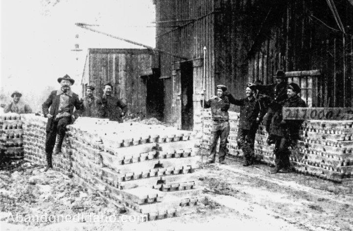 This photo from 1912 shows lead-silver bars ready to be shipped by wagon to the railroad spur at Mackay. Each bar weighed 107 lbs. Most hard rock mines in Idaho consisted of underground shafts and tunnels with hoists or ore cars on tracks to bring the ore to the surface. A mill would then pulverize the ore into a “concentrate” which resembled sand. Ore concentrate is partially processed in order to make the subsequent smelting more efficient. The concentrate from the Clayton Mine was then shipped to a smelter, sometimes as far away as Utah, where gold, silver, or lead was separated from the unusable material. The Clayton Mine, conveniently, had this smelter that was a short distance away.