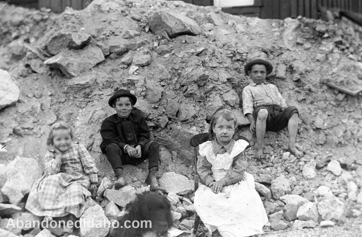 Silver City was not too kid friendly. These four youngsters found themselves on a pile of waste rock from a nearby mine. At least the boys had hats and the girls had dresses, and most of them had shoes.