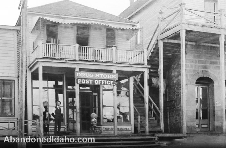 The Getchel Drug Store also served at the Silver City Post Office. Perhaps the little boy was wearing the cowboy hat his father just bought for him at the drug store. The stone building on the right is the courthouse. This building has survived over the years and can still be seen today. Nothing remains of the courthouse on the right but a few stone columns.