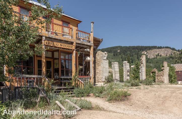 Even though it is abandoned, the drug store/post office is still in relatively good condition, while not much remains of the former courthouse to its right except for a few stone pillars.