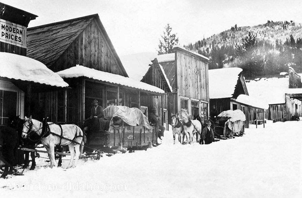 For many years, the only means of transporting equipment and supplies to Atlanta was via horse-drawn wagon from Rocky Bar over a mountain pass 7,800 feet high. In the winter, operators switched to horse-drawn freight wagon.