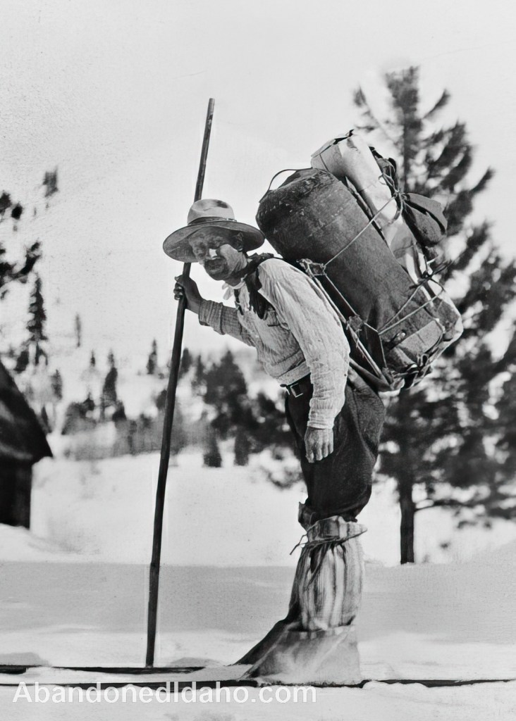 This is Frank Stevens in 1920 with an 80-lb. sack of mail. He was a mail carrier on the route between Rocky Bar and Atlanta, a 15-mile trip over a mountain pass 7,800 feet high. Between 1892 and 1913, seven mail carriers lost their lives on this route due to avalanches. This was one of the most dangerous mail routes in the country.